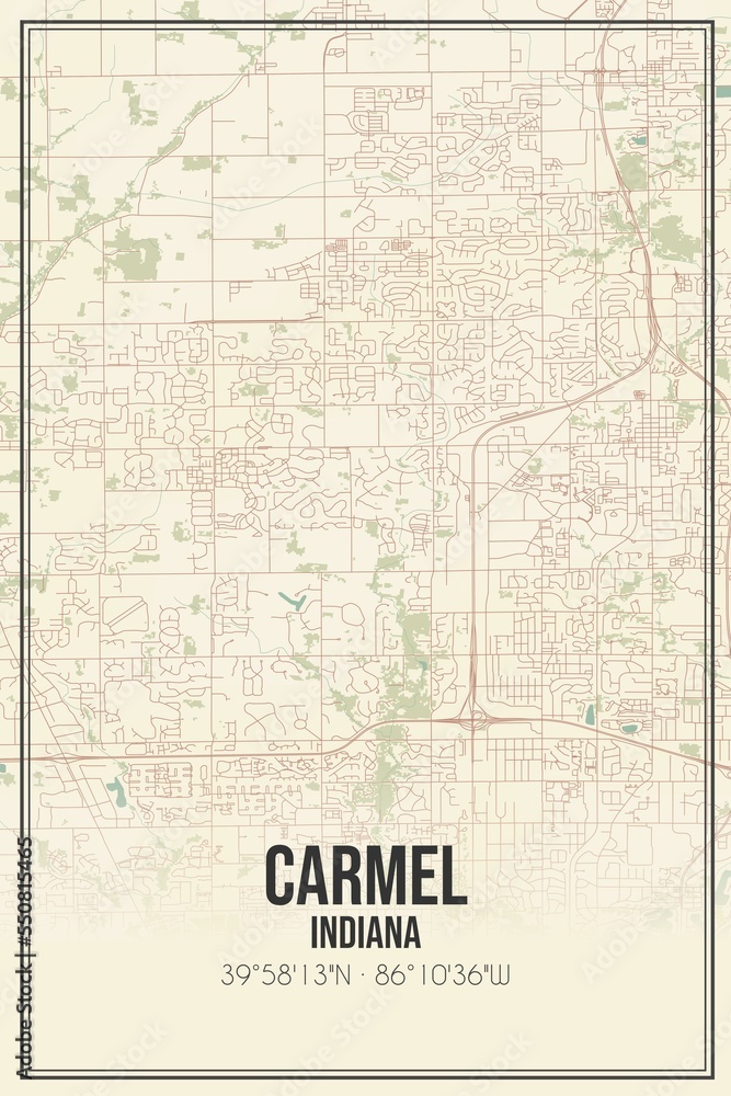 Retro US city map of Carmel, Indiana. Vintage street map. Stock